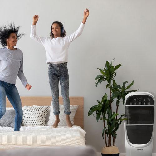 Eeese Lea est un appareil 2-en-1. Avec 8 vitesses de ventilation, le rafraîchisseur et humidificateur d’air Lea a beaucoup à offrir. L’appareil peut être utilisé toute l’année, notamment comme rafraîchisseur d’air en été, où il peut réduire la température ambiante de 3 à 4 °C. En hiver, son utilisation comme humidificateur contribue à un climat intérieur sain et à un meilleur taux d’humidité. Le niveau de ventilation le plus élevé génère un niveau sonore de seulement 55 dB. Eeese Lea est équipé d’une fonction pratique de minuterie de 12 heures, d’un réservoir d’eau amovible avec filtre à air lavable et d’un panneau de commande tactile avec télécommande.