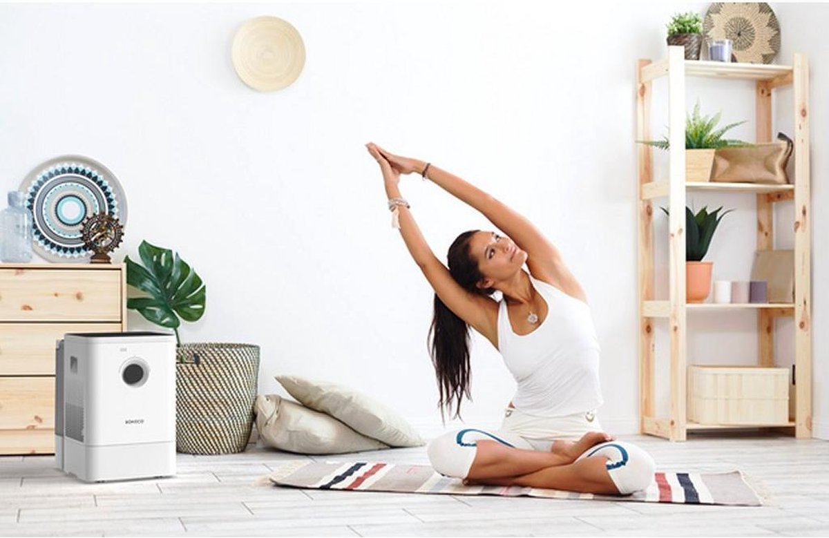 Humidification par évaporation sans diffusion de calcaire. Protège le parquet et le bois contre le dessèchement et convient aux personnes souffrant d’asthme et d’allergies. Convient pour des pièces jusqu’à 60 m² (150 m³). Plusieurs composants de cet humidificateur peuvent être facilement nettoyés au lave-vaisselle. Laveur d’air Le laveur d’air Boneco W400 humidifie et purifie l’air. L’humidificateur est équipé d’un tapis évaporateur rotatif en plastique qui assure une évaporation de l’eau sans calcaire, également appelée évaporation douce. Lors de la rotation, le tapis absorbe l’eau du réservoir, diffuse de la vapeur d’eau dans l’air et élimine des particules telles que la poussière domestique et le pollen. Ce filtre évaporateur est facile à nettoyer. Salon, chambre ou bureau Le laveur d’air Boneco W400 garantit une humidité saine et un air propre dans chaque salon, chambre ou petit bureau jusqu’à 60 m²/150 m³. Idéal pour les personnes souffrant d’asthme, d’allergies ou de troubles respiratoires. L’humidificateur aide également à prévenir le dessèchement excessif et les fissures du parquet. Réservoir d’eau Le Boneco W400 dispose d’un réservoir d’eau ainsi que d’un réservoir supplémentaire, offrant une capacité totale de 12 litres pour une durée d’humidification prolongée. Application Boneco Grâce à l’application Boneco, le W400 est facile à utiliser et à naviguer dans le menu. Il est possible de sélectionner les modes AUTO, SLEEP ou BABY, ainsi que d’activer le verrouillage et la fonction minuterie. Nettoyage facile Le Boneco W400 est facile à nettoyer. Le réservoir peut être rincé facilement et l’eau doit être renouvelée régulièrement. Les pièces lavables peuvent être nettoyées au lave-vaisselle. Ionic Silver Stick Le laveur d’air Boneco évapore l’eau sans calcaire, ce qui rend inutile l’utilisation d’une cartouche anticalcaire. Pour maintenir une eau exempte de bactéries, il est possible d’utiliser un Ionic Silver Stick. Caractéristiques Humidificateur et purificateur d’air en un seul appareil Pour salon, chambre ou petit bureau jusqu’à 60 m²/150 m³ Humidification de l’air avec 2 niveaux (jour/nuit) Débit d’humidification env. 400 ml/h Capacité du réservoir 4,5 litres et réservoir supplémentaire de 7,5 litres Utilisation facile via l’application Boneco (Bluetooth) ou manuellement Fonctions supplémentaires via l’application. AUTO, SLEEP, BABY et minuterie Nettoyage facile, plusieurs pièces compatibles lave-vaisselle Fonctionnement très silencieux, au niveau 1 < 25 dB(A) Possibilité de diffusion d’huiles parfumées Couleur blanche Consommation électrique réduite, seulement 13 à 30 W