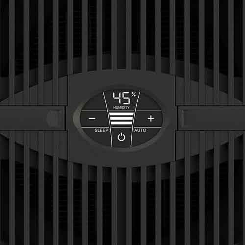 Le mode nuit (SLEEP) offre un éclairage d’écran tamisé et un fonctionnement ultra-silencieux. En mode automatique, la puissance s’adapte automatiquement au taux d’humidité ambiant. L’humidité est mesurée, affichée et régulée en temps réel grâce à l’hygrostat intégré.