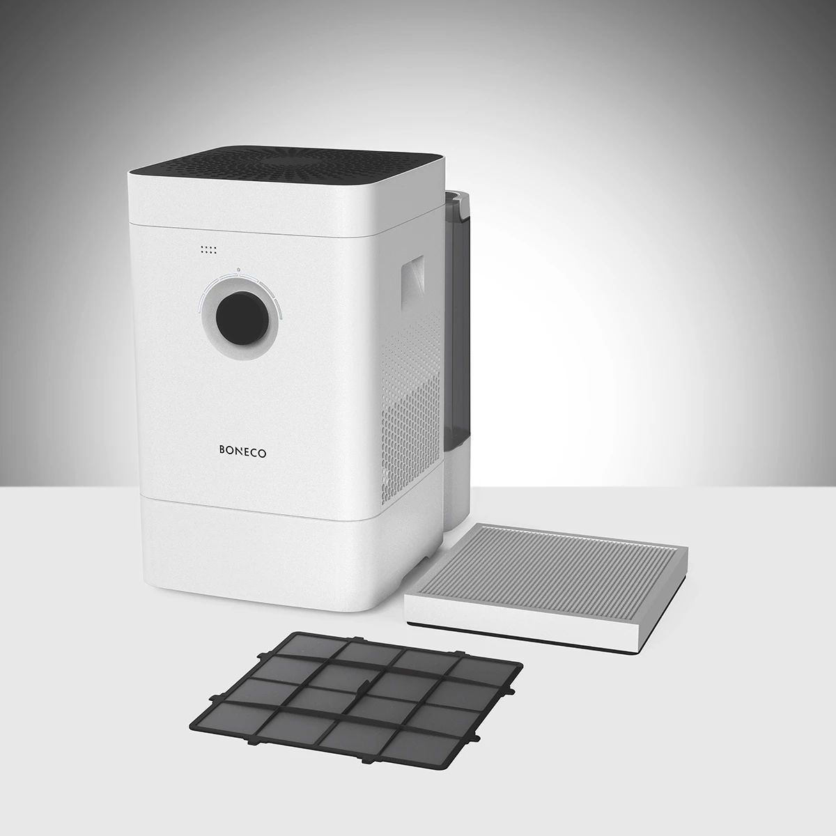 BONECO H400 Hybrid – Humidificateur / Laveur d’air Réservoir d’eau de 12 litres pour une longue autonomie Cet appareil polyvalent 3-en-1 peut être utilisé comme purificateur d’air, humidificateur ou en mode hybride (humidification et purification combinées). Il est conçu pour des pièces jusqu’à 60 m² / 150 m³. Le BONECO H400 offre des performances exceptionnelles en humidification et purification de l’air, garantissant une qualité de l’air saine et hygiénique dans les environnements privés ou professionnels, tels que bureaux, chambres ou salons. Il est idéal pour les personnes allergiques et dispose d’un réservoir d’eau extra large de 12 litres pour une utilisation prolongée sans remplissage. L’utilisation du BONECO Hybrid est très simple. Une simple pression sur un bouton suffit pour démarrer l’appareil, ou vous pouvez utiliser l’application BONECO via Wi-Fi. Programmez facilement votre climat de confort personnel, humidité et température comprises. Le H400 s’occupe du reste. Choisissez entre les modes Humidifier, Purifier ou Hybrid, ainsi que les modes AUTO, SLEEP (pour une nuit reposante) ou BABY (idéal pour les jeunes familles), avec une humidité optimale. Le compartiment à arômes intégré permet d’ajouter votre huile essentielle préférée. L’équipement comprend également une minuterie ON/OFF, un verrouillage enfant et un rappel de remplacement du filtre. La mesure et la régulation de l’humidité relative sont assurées par le capteur d’humidité intégré. Le HYBRID H400 apporte un véritable bien-être à votre intérieur. Le BONECO H400 Hybrid est très économe en énergie. Le pré-filtre permanent et le filtre hybride supplémentaire (filtre à charbon actif + filtre HEPA) garantissent un air sain et sans germes. Ils filtrent les cheveux, la poussière domestique, les particules ultrafines, les bactéries, les virus et absorbent également les mauvaises odeurs. Le tapis d’évaporation est facile à nettoyer et assure une humidification efficace de l’air. Tous les composants peuvent être nettoyés facilement dans la machine à laver ou le lave-vaisselle. Caractéristiques Pour des pièces jusqu’à 60 m² / 150 m³ (Capacité d’humidification: 400 ml/h) Faible consommation d’énergie Puissance absorbée: 14,7 W CADR particules: < 100 m³/h Système HYBRID 3-en-1 3 modes de fonctionnement: Humidifier, Purifier ou Hybrid Commande simple par bouton rotatif (2 niveaux de puissance pour un fonctionnement jour ou nuit) Capteur d’humidité intégré Mesure et régulation de l’humidité en temps réel Application BONECO (Wi-Fi) Modes SLEEP et BABY Minuterie ON/OFF Tapis d’évaporation lavable en machine ou au lave-vaisselle Filtre hybride: charbon actif + HEPA Pré-filtre Réservoir d’eau extra large: 12 litres Arrêt automatique lorsque le réservoir est vide (LED AUTO rouge) Remplissage facile du réservoir Composants de haute qualité pour une longue durée de vie Niveau sonore: 25 – 55 dB(A) Livré avec Ionic Silver Stick (ISS)