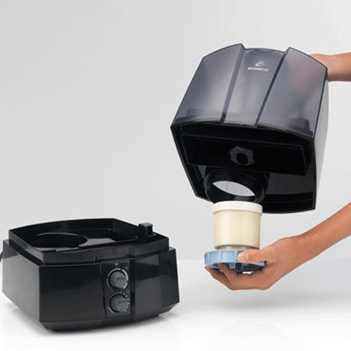 L’humidificateur Boneco 7145 utilise des vibrations à haute fréquence pour transformer l’eau en une fine nébulisation. Cette brume microfine est diffusée dans la pièce par un ventilateur silencieux, où elle s’évapore immédiatement. La cartouche anticalcaire interchangeable de l’humidificateur à ultrasons garantit l’évaporation d’une eau adoucie.