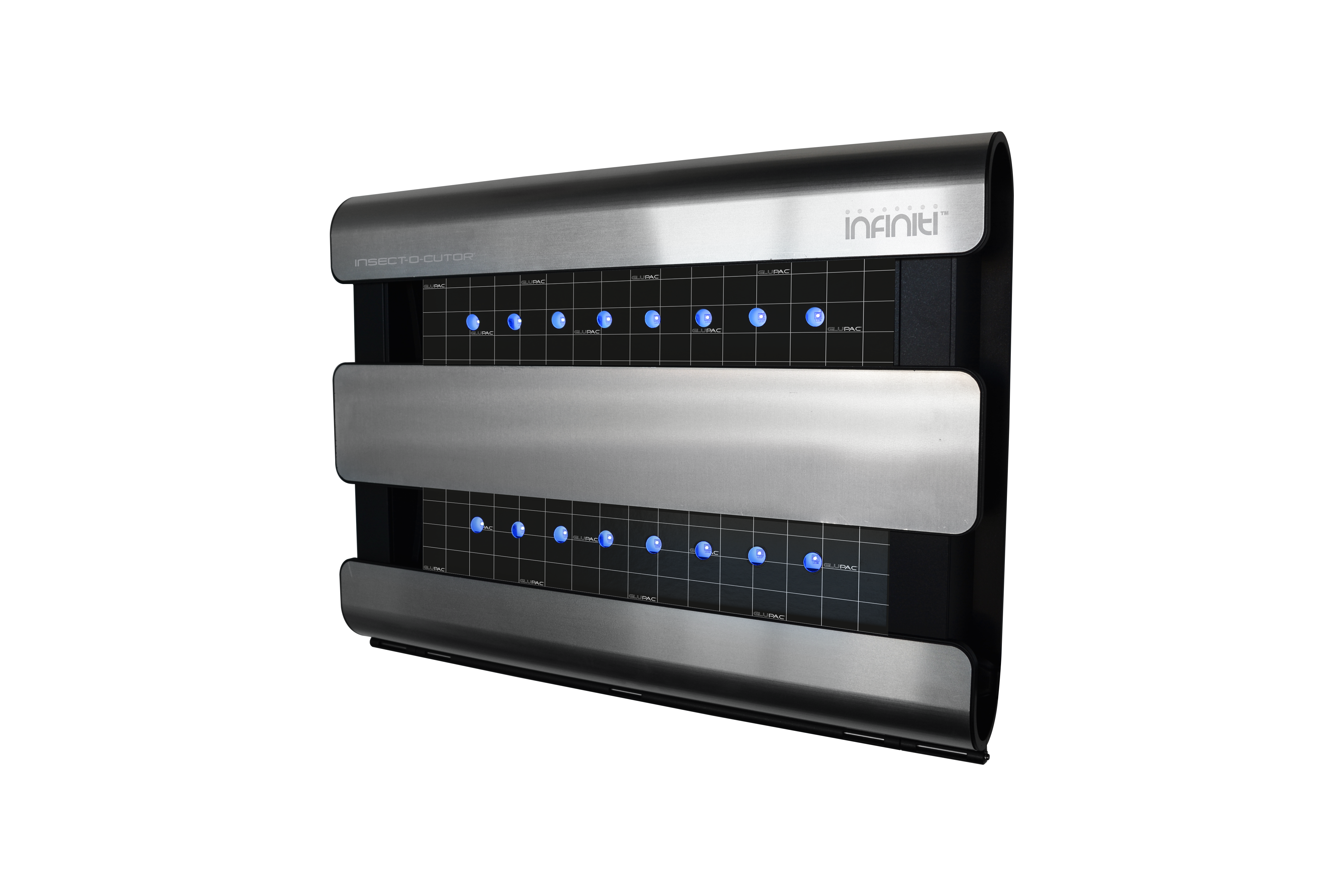 Insect-O-Cutor Infiniti® – Piège à insectes décoratif et économe en énergie pour environnements professionnels L’Insect-O-Cutor Infiniti® a été spécialement conçue pour une utilisation dans les environnements professionnels. Ce piège à insectes décoratif et à faible consommation d’énergie combine une source lumineuse UV LED très efficace avec la feuille collante Glupac®, offrant une technologie de capture d’insectes unique. Le modèle argenté Infiniti® couvre une surface allant jusqu’à 120 m², avec une faible consommation d’énergie et un entretien facile. Il peut être installé au mur ou au plafond.
