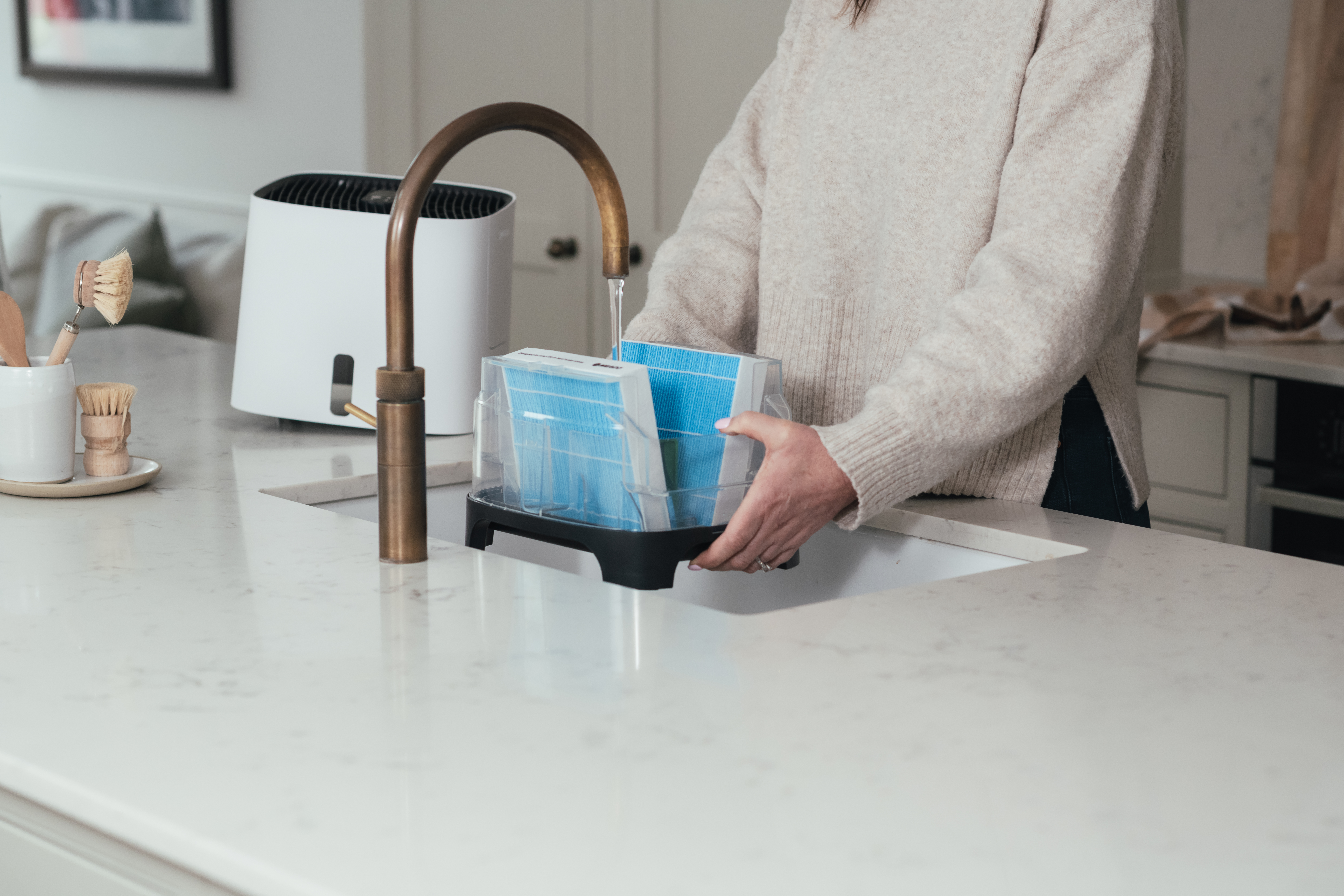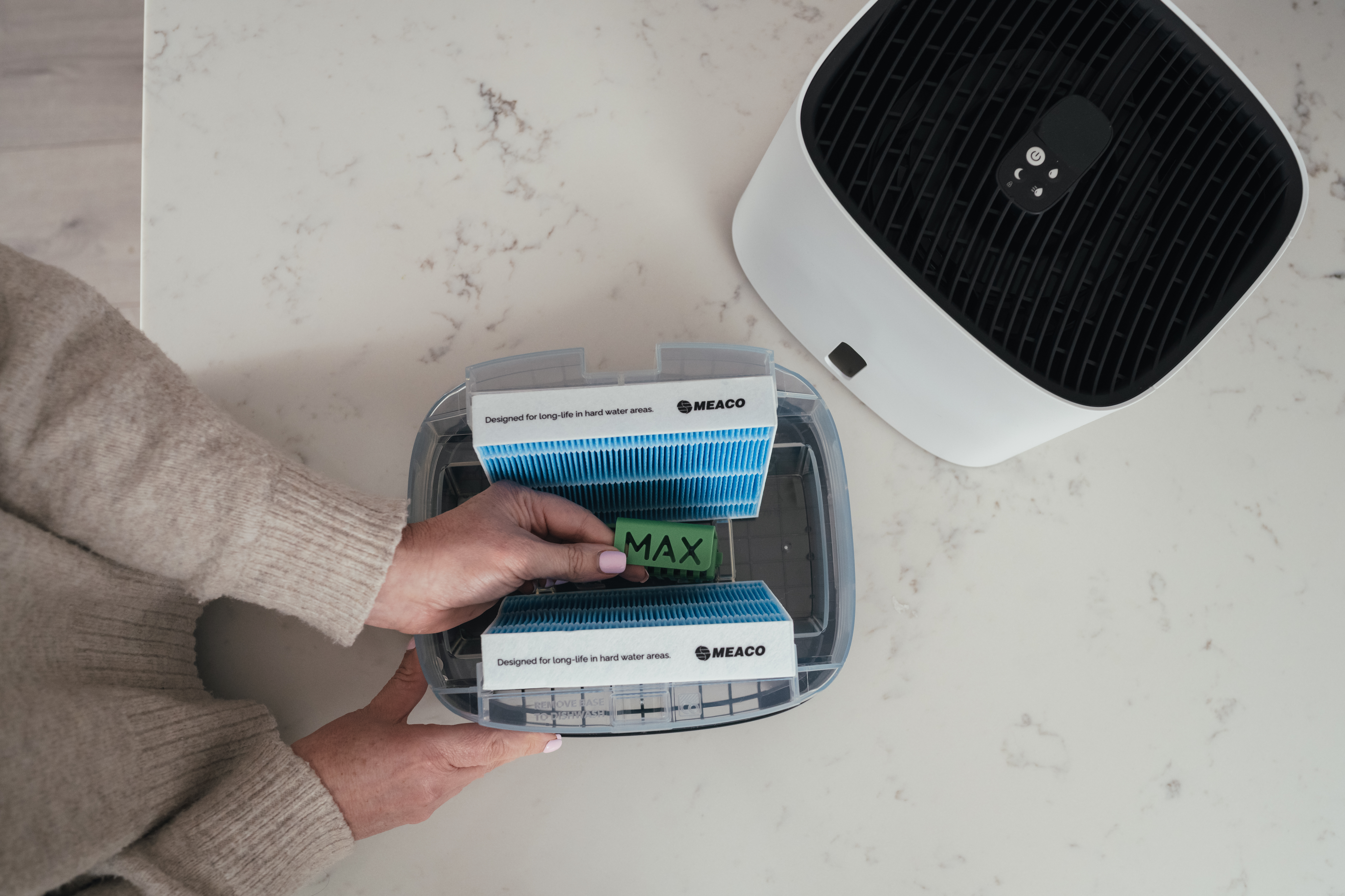 Les deux filtres d’évaporation de l’Armin 300 absorbent l’humidité du réservoir d’eau et la diffusent dans l’air ambiant sec. Au cours de ce processus, les particules de calcaire restent sur le filtre et ne se propagent pas dans l’environnement. L’Armin ne provoque donc aucun dépôt blanc dans la pièce. Les filtres d’évaporation de l’Armin ont une longue durée de vie et peuvent être tournés jusqu’à quatre fois pour prolonger leur utilisation avant leur remplacement.