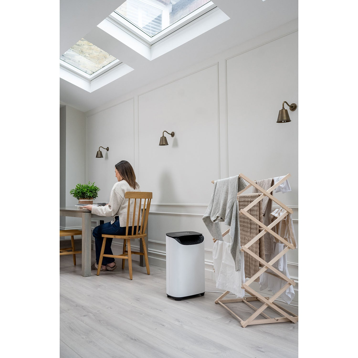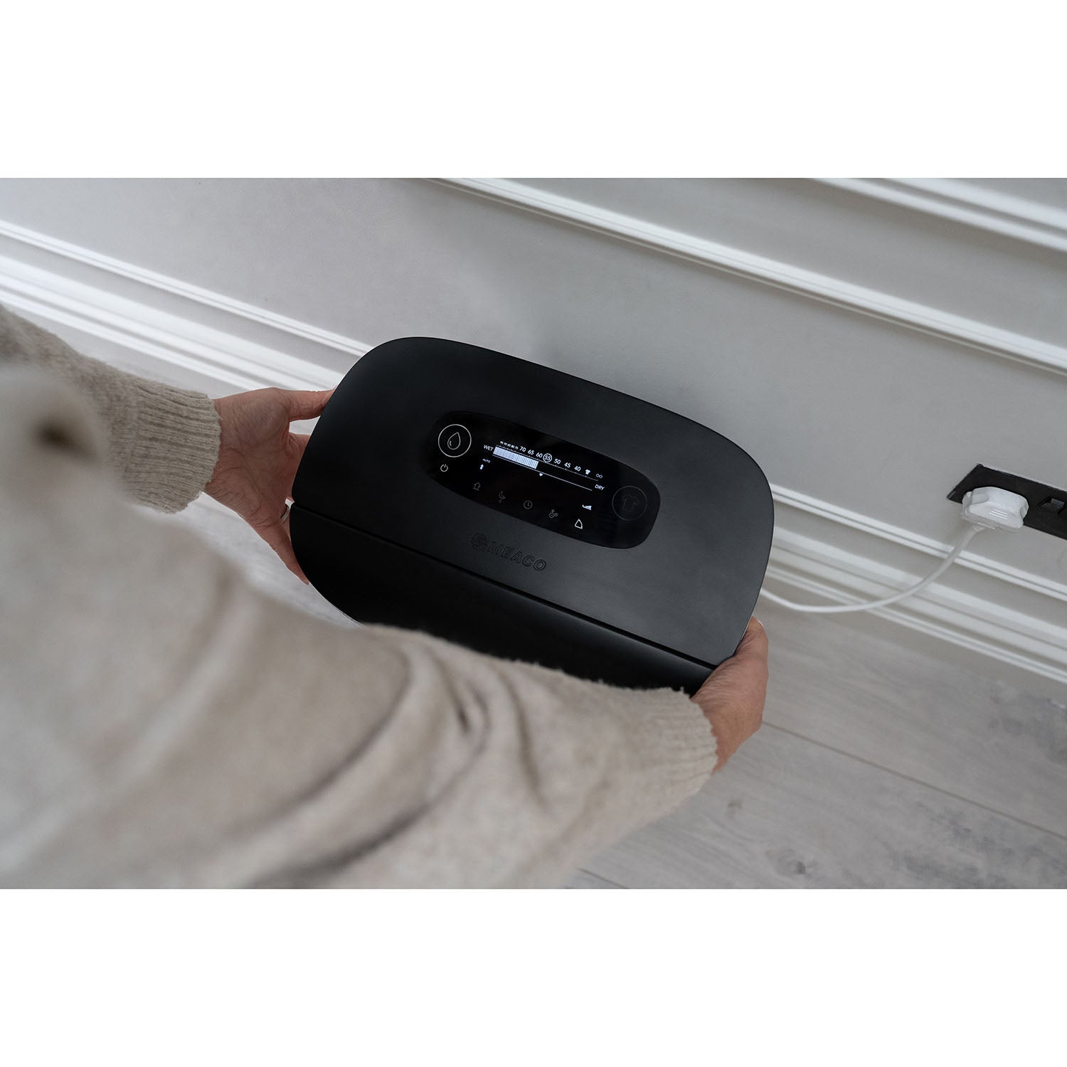 Moins de temps à sécher. Plus de temps à vivre. Le DD8L Pro n’est pas qu’un simple déshumidificateur – c’est votre allié quotidien pour le linge. Le mode Laundry combine chaleur, flux d’air et automatisation intelligente pour un séchage plus rapide que tout autre appareil. La lame d’air automatique oriente le flux directement sur le linge, idéale pour le séchage intérieur durant les hivers humides ou dans les pièces non chauffées. Efficace quand vous le souhaitez. Puissant quand il le faut. Avec le Smart Energy Mode, le DD8L Pro ajuste automatiquement la puissance selon la différence entre l’humidité réelle et la valeur cible. Silencieux et économe lorsqu’il reste proche du niveau souhaité, il augmente automatiquement la puissance lorsque l’humidité s’élève. Connecté et simple à contrôler. Compatible avec Google et Alexa, le DD8L Pro se connecte via WiFi à l’application Meaco, pour surveiller et gérer votre appareil à distance – à la maison, sur un bateau, dans un garage ou une résidence secondaire. Un usage quotidien simplifié. L’écran Chase Display affiche des messages clairs plutôt que des codes d’erreur, et le rangement de câble intégré permet une installation élégante contre le mur. Silencieux. Sans lumière. Parfait pour la nuit. Le Mode Nuit désactive les voyants et sons tout en maintenant un flux d’air doux – idéal pour les chambres et les nurseries. Ioniseur antibactérien. L’ioniseur stérilisant intégré neutralise bactéries, spores et allergènes pour un air plus propre et plus sain. Installation murale. Tranquillité assurée. Libérez de l’espace au sol grâce au support mural (vendu séparément) et au kit de drainage continu inclus (12,5 mm). Garantie 3 ans. Conçu au Royaume-Uni, durable et couvert par une garantie de 3 ans.