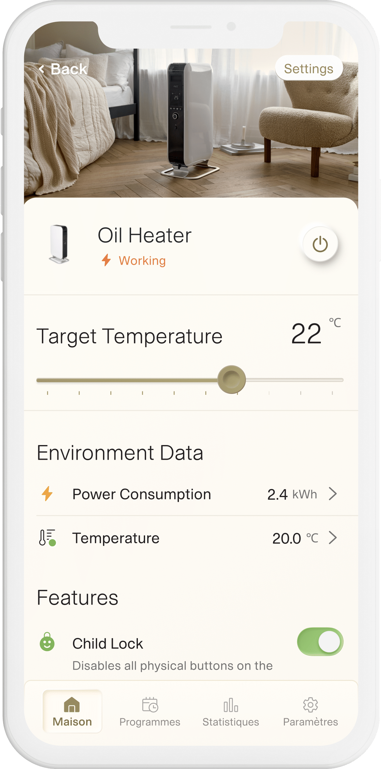 Le radiateur bain d’huile est équipé d’une module WiFi intégrée. Cela signifie qu’aucun « hub » n’est nécessaire et que le thermostat n’a pas besoin d’être remplacé. Le radiateur se connecte directement à votre réseau WiFi via Bluetooth.