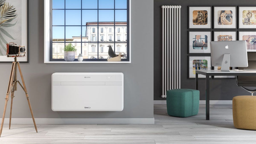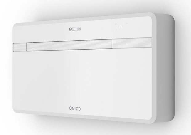 Le Olimpia Splendid Unico EVO 30 HP EVAN est un climatiseur pompe à chaleur monobloc sans unité extérieure, que vous pouvez installer vous-même. Il utilise le fluide frigorigène R32, à faible potentiel de réchauffement global (GWP), réduisant ainsi son impact environnemental. Doté d’un compresseur Twin Rotary de haute efficacité et d’un système de contrôle électronique avancé, ce climatiseur garantit des performances optimales avec un niveau sonore très bas. En mode Silence, il ne génère que 30 dB(A) – parfait pour les chambres, bureaux ou pièces calmes. Avec une profondeur de seulement 18 cm, ce système est particulièrement compact et peu encombrant. Idéal pour refroidir et chauffer des espaces jusqu’à 30 m². Parfait pour les bâtiments où une unité extérieure est interdite ou indésirable. Aucune unité extérieure visible sur la façade – seulement deux grilles de ventilation discrètes et une petite évacuation pour l’eau de condensation. Facile et rapide à installer – une solution élégante et performante.