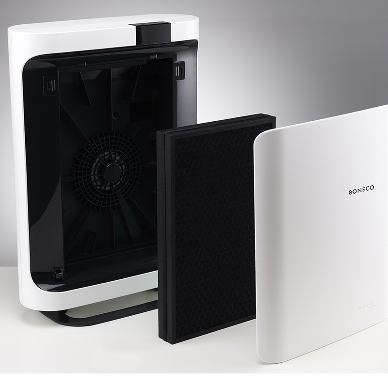Grâce au choix entre différents filtres, le Boneco P500 peut être adapté à vos préférences personnelles. Le purificateur d’air est livré de série avec le filtre HEPA Allergies, mais il est également possible d’utiliser le filtre HEPA pour chambre de bébé ou le filtre HEPA Smog. Les trois filtres pour le Boneco P500 sont tous équipés d’un préfiltre et d’un filtre à charbon actif contre les odeurs. Le purificateur d’air Boneco P500 dispose d’un design primé. Il est lauréat du Red Dot Design Award. C’est un purificateur d’air élégant et peu encombrant. Grâce à son design épuré, le P500 s’intègre parfaitement dans tous les environnements, à la maison comme au bureau. Grâce à son fonctionnement silencieux, le purificateur d’air ne perturbe pas votre tranquillité. Le Boneco P500 est ultra silencieux au niveau le plus bas. Il élimine notamment les allergènes, le pollen, les virus, la poussière, les squames d’animaux, les acariens, la fumée et les odeurs de l’air. Profitez d’un air frais comme en montagne. Caractéristiques Solution de filtration individuelle pour chaque pièce et chaque besoin. Idéal pour la chambre, le salon et le bureau. Purification de l’air efficace. 5 niveaux de ventilation. Mode de fonctionnement automatique. Mode nuit. Mode turbo. Fonctionnement ultra silencieux au niveau le plus bas. Faible consommation d’énergie. Minuterie. Affichage de la qualité de l’air. Utilisation rapide, simple et intuitive. Écran numérique avec fonctions faciles à utiliser. Indicateur de remplacement du filtre. Télécommande. Design élégant et fin. Support pour l’utilisation de parfums. Composants de haute qualité pour une longue durée de vie. Le P500 est livré de série avec le filtre HEPA Boneco A501 ALLERGIE.