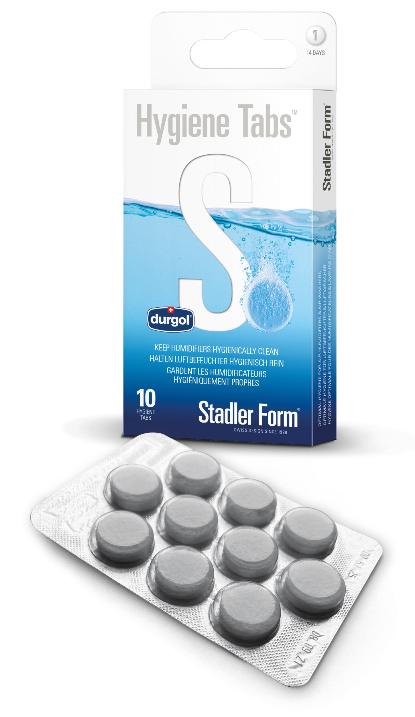 Les Hygiene Tabs de Stadler Form assurent une hygiène parfaite de l’eau dans votre humidificateur ou laveur d’air. Spécialement développées en Suisse, ces pastilles se dissolvent complètement dans l’eau et agissent immédiatement, sans dégager d’odeur. Même avec l’ajout quotidien d’eau fraîche, les ingrédients actifs restent efficaces, garantissant jusqu’à deux semaines d’eau propre et hygiénique avec une seule pastille. L’utilisation est simple : ajoutez une pastille dans le réservoir d’eau de votre humidificateur ou laveur d’air toutes les deux semaines et remplissez-le d’eau. La pastille se dissout complètement et enrichit l’air intérieur d’une eau propre et hygiénique. Développées par Durgol, le spécialiste suisse des produits de nettoyage, les pastilles d’hygiène sont fabriquées en Suisse et sont biodégradables, se décomposant naturellement sans laisser de résidus nocifs pour les personnes, les animaux ou l’environnement.