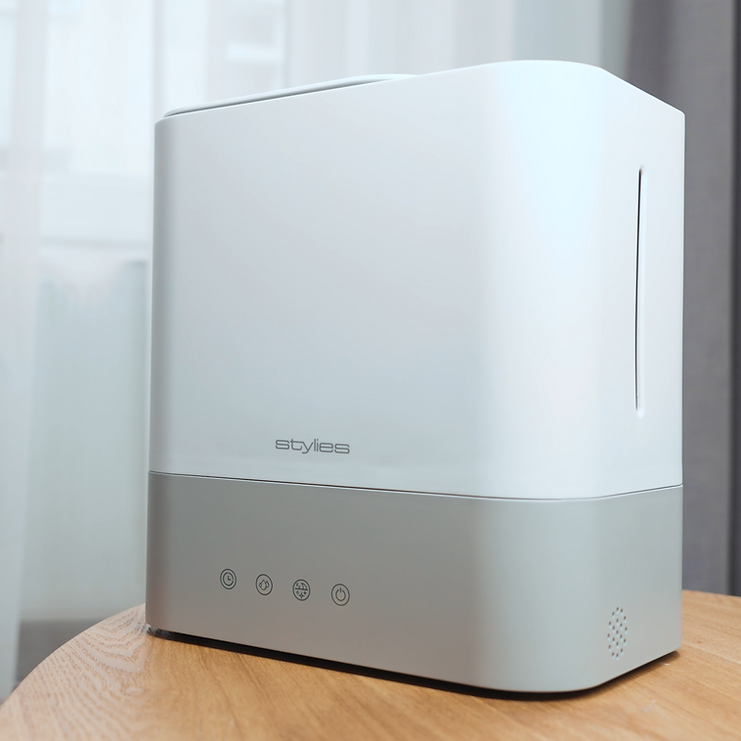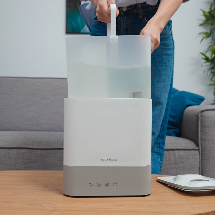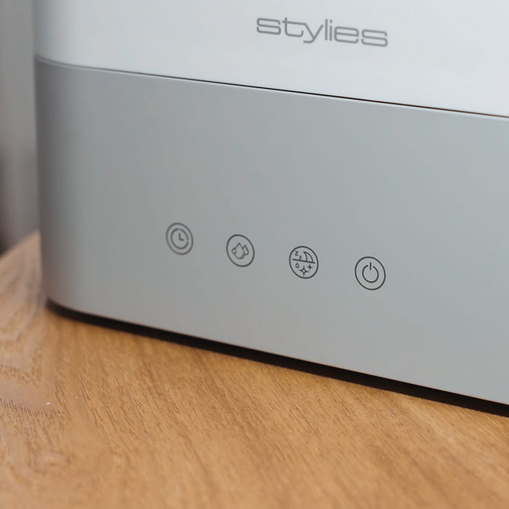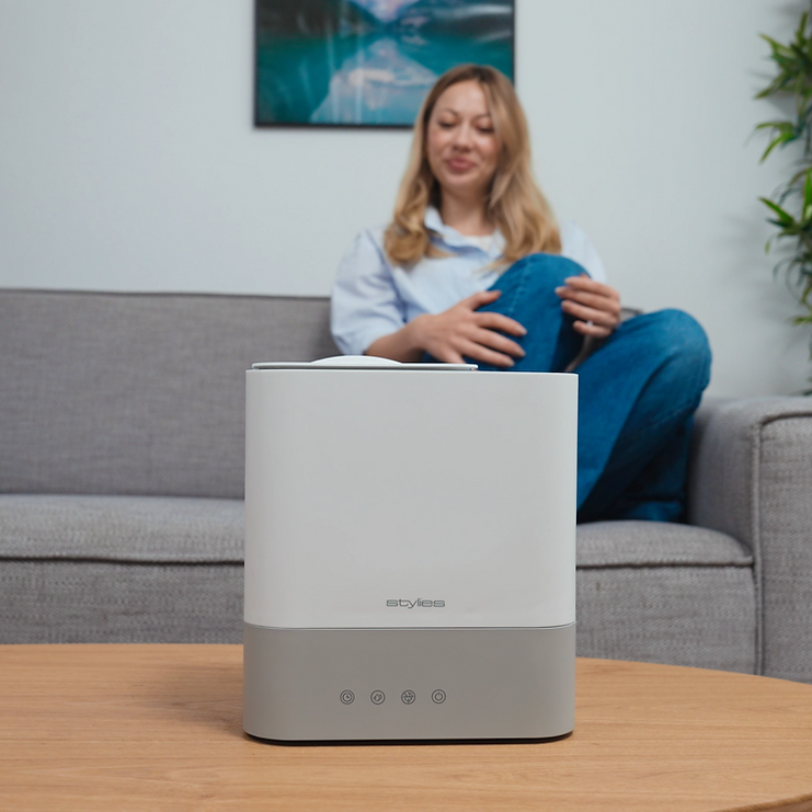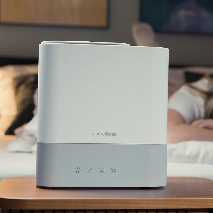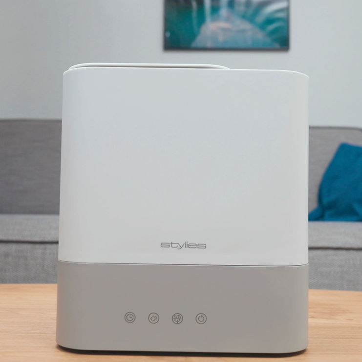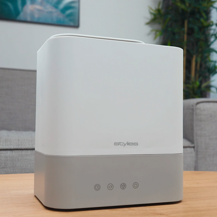 Le Stylies Astra est un humidificateur à vapeur chaude (vaporisateur) performant, conçu pour augmenter rapidement et efficacement le taux d’humidité de l’air tout en garantissant une humidification hygiénique. Grâce au chauffage de l’eau à haute température, la vapeur émise est stérilisée, ce qui contribue à réduire les bactéries et les germes. Il convient parfaitement aux salons, chambres et pièces jusqu’à 55 m². Avec une capacité d’humidification maximale de 400 ml par heure, le Stylies Astra améliore rapidement le confort de l’air intérieur. Son réservoir de 5 litres permet une utilisation prolongée sans remplissage fréquent. Technologie vapeur chaude avec stérilisation haute température Contrairement aux humidificateurs à évaporation froide, l’Astra utilise une évaporation thermique, permettant : une réduction efficace des bactéries une humidification plus hygiénique une montée rapide du taux d’humidité Cette technologie est idéale en période hivernale ou dans les environnements nécessitant une hygiène renforcée. Fonctions intelligentes pour un confort optimal Deux niveaux d’humidification Minuteur programmable de 4 ou 8 heures Mode nuit, avec extinction complète des LED Fonction aromathérapie pour huiles essentielles hydrosolubles Ionisation négative pour une sensation d’air plus frais Sécurité et simplicité d’utilisation Arrêt automatique lorsque le réservoir est vide ou retiré Avertissements visuels et sonores en cas de manque d’eau Classe de protection I Utilisation possible par les enfants dès 8 ans, sous surveillance Après remplissage, l’appareil reprend automatiquement les réglages précédents. Mode auto-nettoyage et entretien Le mode d’auto-nettoyage aide à limiter les dépôts de calcaire sur la plaque chauffante. Le système active et désactive le chauffage de manière cyclique pendant plusieurs heures. Après environ 50 heures de fonctionnement, un rappel de nettoyage est automatiquement affiché. Caractéristiques techniques Type : humidificateur à vapeur chaude Capacité max. : 400 ml/h Réservoir d’eau : 5 litres Surface recommandée : jusqu’à 55 m² Puissance : 300 W Tension : 220–240 V Fréquence : 50/60 Hz Classe de protection : Classe I