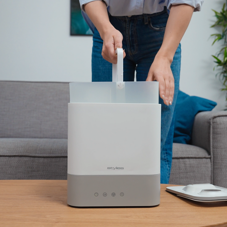 Malgré son design compact et moderne, le Stylies Astra offre une capacité d’humidification impressionnante allant jusqu’à 400 ml par heure, et convient aux pièces jusqu’à 55 m². En tant qu’humidificateur à vapeur chaude, il chauffe et stérilise l’eau à haute température, garantissant une humidification hygiénique et un air intérieur plus sain. Le Astra dispose de deux niveaux d’humidification, d’un arrêt automatique lorsque le réservoir d’eau est vide et d’un minuteur programmable de 4 ou 8 heures. Grâce à la fonction aromathérapie et à l’ionisation négative, il contribue à une atmosphère fraîche et agréable. Pour un confort optimal, il est également équipé d’un mode nuit sans éclairage LED et d’un mode d’auto-nettoyage réduisant les dépôts de calcaire.