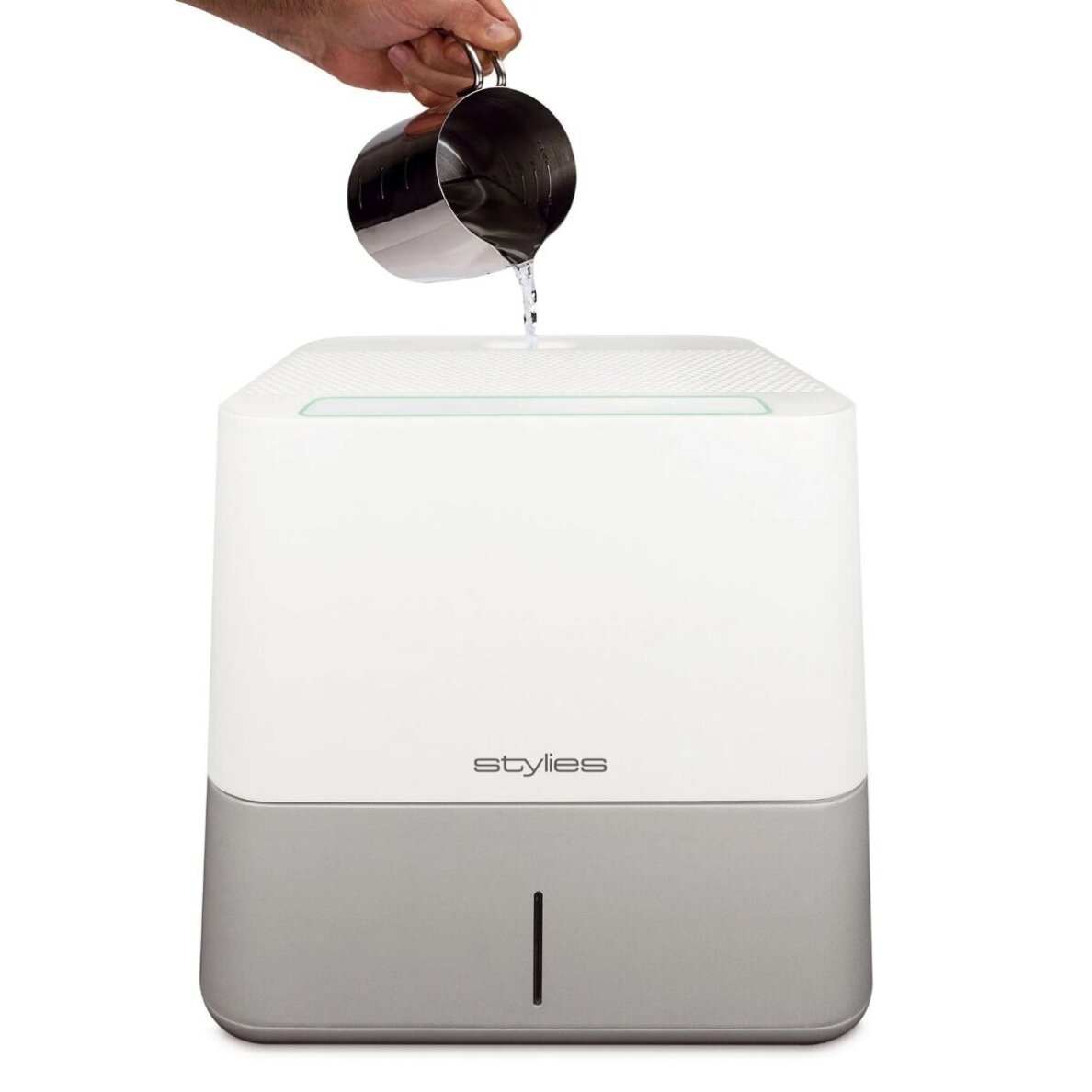 Le Stylies Signum est un humidificateur par évaporation élégant et efficace qui contribue à créer un environnement intérieur confortable et sain. Grâce à la technologie d’évaporation naturelle, l’air est humidifié de manière hygiénique et économe en énergie, sans produire de brume visible ni de dépôts blancs. L’humidité de l’air reste ainsi équilibrée de façon naturelle, créant une atmosphère agréable dans la maison. Le Signum fonctionne avec une cartouche filtrante antibactérienne spécialement traitée qui absorbe l’eau du réservoir. Des ventilateurs internes font passer l’air sec à travers ce filtre humidifié et diffusent ensuite l’air humidifié de manière homogène dans la pièce. Ce processus garantit une humidification efficace et sûre, tout en évitant une humidification excessive. Une humidification efficace et naturelle Avec une capacité d’humidification allant jusqu’à 400 ml par heure, le Stylies Signum est capable d’augmenter efficacement le taux d’humidité dans les espaces de vie. Son réservoir d’eau de 6,5 litres permet une utilisation prolongée sans remplissage fréquent. Grâce à l’indicateur de niveau d’eau, vous pouvez facilement vérifier quand il est nécessaire d’ajouter de l’eau. Régulation automatique et plusieurs niveaux de puissance Le Stylies Signum dispose d’un mode automatique qui régule l’humidité dans la pièce. L’appareil adapte automatiquement l’intensité de l’humidification afin de maintenir un niveau d’humidité optimal. Vous pouvez également choisir entre trois vitesses de ventilation (faible, moyenne et élevée), afin d’adapter les performances à la taille de la pièce et à vos préférences. Fonction minuterie et mode nuit silencieux Pour plus de confort, le Signum est équipé d’une fonction minuterie qui permet d’éteindre automatiquement l’appareil après 2, 4 ou 8 heures. L’appareil dispose également d’un mode nuit qui désactive tous les indicateurs LED. L’humidificateur est ainsi parfaitement adapté à une utilisation dans les chambres, car il fonctionne silencieusement et sans lumière gênante. Hygiénique et facile à entretenir Le Stylies Signum a été conçu pour offrir une utilisation hygiénique et un entretien simple. L’appareil utilise un Clean Cube, qui aide à réduire les bactéries et les germes dans l’eau, contribuant ainsi à une humidification plus propre. La partie inférieure du boîtier avec le réservoir d’eau est compatible avec le lave-vaisselle, ce qui facilite le nettoyage. Pour des performances optimales, il est recommandé de renouveler l’eau régulièrement et de remplacer la cartouche filtrante périodiquement. Fonction arôme pour plus de confort En plus d’humidifier l’air, le Stylies Signum dispose d’un compartiment pour arômes, dans lequel vous pouvez ajouter une petite quantité d’huile essentielle ou de parfum. Vous pouvez ainsi profiter d’un air agréablement parfumé tout en maintenant un taux d’humidité optimal. Design suisse élégant Comme on peut s’y attendre de Stylies, le Signum combine fonctionnalité et design suisse moderne et minimaliste. Grâce à son apparence élégante, cet humidificateur s’intègre facilement dans différents styles d’intérieur et convient parfaitement aux salons, chambres, bureaux ou espaces de travail.