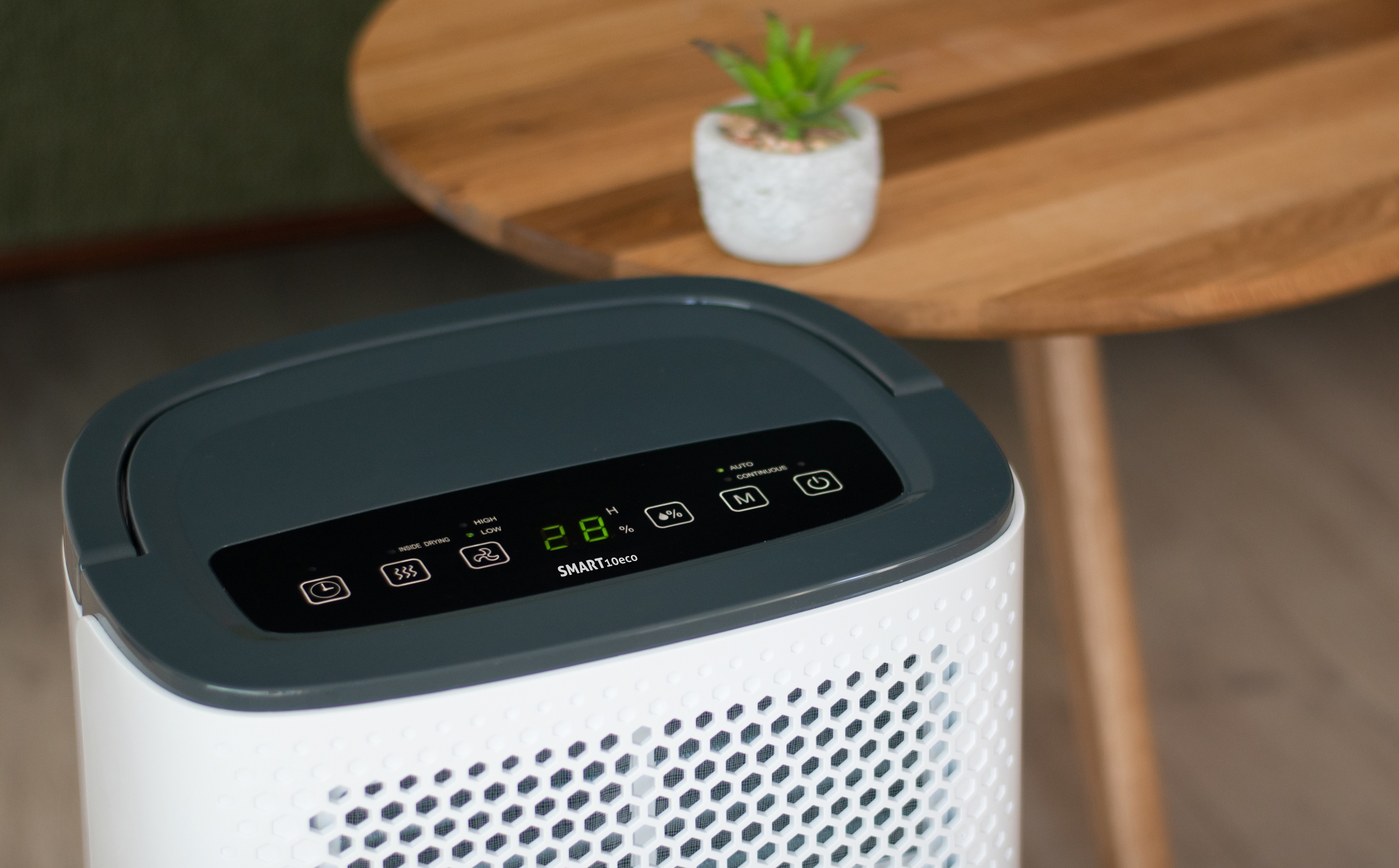 Compact, élégant et facile à utiliser, le SMART 10 eco est un déshumidificateur de type compresseur petit mais puissant dans notre liste. Avec une capacité de déshumidification de 10 litres/jour, il est parfait pour toute pièce, dans votre maison ou au bureau.
