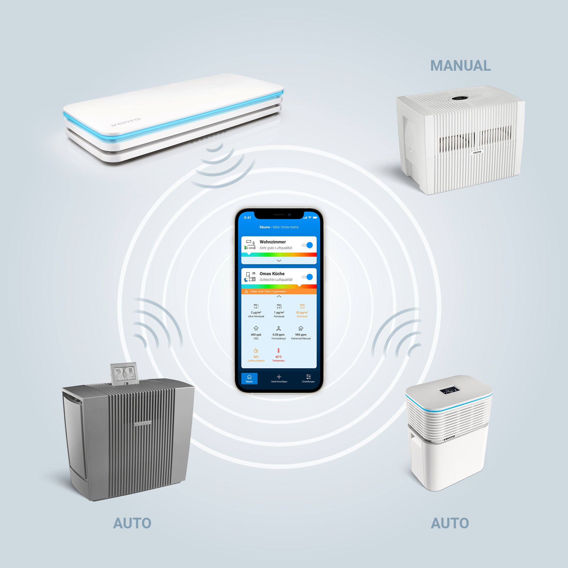 SURVEILLANCE CONTINUE DE LA QUALITÉ DE L’AIR Le Venta AirSense ECO est équipé de trois capteurs qui mesurent, surveillent et analysent avec précision et fiabilité, en temps réel, les gaz COV, l’humidité relative et la température ambiante. Les gaz COV (Composés Organiques Volatils) sont des substances gazeuses ou sous forme de vapeurs d’origine organique présentes dans l’air. Les sources possibles de COV dans les espaces intérieurs sont les matériaux de construction ou les objets du quotidien qui émettent ces substances. Il peut s’agir, par exemple, de revêtements de sols, murs et plafonds, de peintures, vernis, colles, meubles, appareils électriques ou jouets. C’est pourquoi les COV sont presque toujours présents dans l’air, généralement en faibles quantités. Toutefois, des concentrations plus élevées peuvent provoquer des troubles physiques, tels que des allergies. Il est donc essentiel de surveiller ces valeurs. Le Venta AirSense ECO détecte aussi bien les gaz COV nocifs émis par les objets du quotidien que des niveaux d’humidité ou des températures trop faibles ou trop élevés. Les valeurs mesurées sont affichées par la couleur de l’anneau LED du Venta AirSense. Lorsque la valeur est idéale, l’anneau s’allume en vert. Lorsqu’elle est acceptable, il devient jaune. En cas de valeur critique, l’anneau LED devient rouge et une alerte est envoyée directement sur l’appareil ou via l’application Venta Home. Vous savez ainsi à tout moment quel est l’état de la qualité de l’air. TOUT VIA UNE SEULE APPLICATION VENTA HOME Le Venta AirSense ECO enregistre les données de l’air, que vous pouvez consulter à tout moment dans l’application Venta Home. Il est ainsi immédiatement possible de reconnaître lorsqu’une valeur critique est atteinte dans une pièce et qu’une action est nécessaire. En cas de valeurs critiques, l’application Venta Home propose des recommandations d’action et des informations sur les causes possibles. Un simple coup d’œil dans l’application. Le taux de CO₂ est par exemple élevé. Il est temps d’aérer efficacement. L’application Venta Home établit également des analyses des valeurs mesurées par période. Évaluations horaires, quotidiennes et mensuelles. Cela permet de tirer des conclusions sur l’évolution de la qualité de l’air liée aux activités quotidiennes et de développer des habitudes plus saines. ENTIÈREMENT AUTONOME – MÊME SANS APPAREILS VENTA Vous ne possédez pas encore de Airwasher ou de purificateur d’air Venta, mais souhaitez néanmoins surveiller la qualité de l’air. Le Venta AirSense ECO est alors la solution idéale, car il fonctionne de manière totalement indépendante. Via l’application Venta Home, il vous informe si la qualité de l’air, par exemple dans une chambre d’enfant ou un salon, est satisfaisante et quand il est nécessaire d’aérer. Il indique également à quel moment l’utilisation d’un Airwasher ou d’un purificateur d’air pourrait être pertinente pour vous. APPAREIL SMART HOME INTELLIGENT – COMMUNIQUE AVEC VOS APPAREILS VENTA Le Venta AirSense ECO est bien plus qu’un simple instrument de mesure du climat intérieur et de la qualité de l’air. Les valeurs mesurées sont transmises aux appareils Venta compatibles avec Venta AirConnect, qui réagissent automatiquement à ces données et se mettent en marche selon le type d’appareil. Par exemple, si le Venta AirSense ECO détecte un air trop sec dans le salon, l’information est transmise à l’Airwasher, qui passe immédiatement au niveau de fonctionnement supérieur. Ainsi, vous ne disposez pas seulement d’une vision claire de la qualité de l’air dans votre pièce. Les appareils compatibles WiFi utilisent automatiquement ces données afin d’assurer un air intérieur optimal. AirSense, application Venta Home, purificateurs d’air, Airwashers et appareils hybrides fonctionnent en parfaite interaction. En tant que partie intégrante du système AirConnect. AS100 AIRSENSE ECO – CARACTÉRISTIQUES Capteur haut de gamme de climat intérieur et de qualité de l’air Conseiller pour un air sain dans chaque pièce Appareil Smart Home intelligent Surveille et analyse en temps réel les composants de l’air grâce à trois capteurs Visualisation en temps réel des valeurs mesurées par la couleur de l’anneau LED Informations détaillées sur chaque valeur individuelle dans l’application Venta Home Analyse des données et recommandations d’action via l’application Venta Home pour un habitat plus sain Appareil Smart Home intelligent pour le pilotage des appareils* compatibles avec Venta AirConnect Alertes en cas de valeurs critiques Utilisable avec ou sans appareils Venta existants Les produits AirSense AS100 et AS150 sont exclusivement destinés à une utilisation dans des espaces résidentiels, de bureaux et de loisirs. Les produits AirSense ne doivent expressément PAS être utilisés dans les conditions suivantes: Dans des zones présentant une atmosphère explosive Dans des environnements à atmosphère agressive Dans des espaces à forte concentration de solvants Dans des espaces à charge de poussières extrêmement élevée À proximité de piscines ou de zones humides En extérieur * APPAREILS RECOMMANDÉS: Venta LW73 Venta LW74