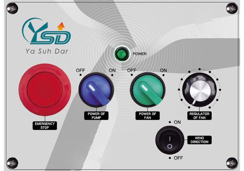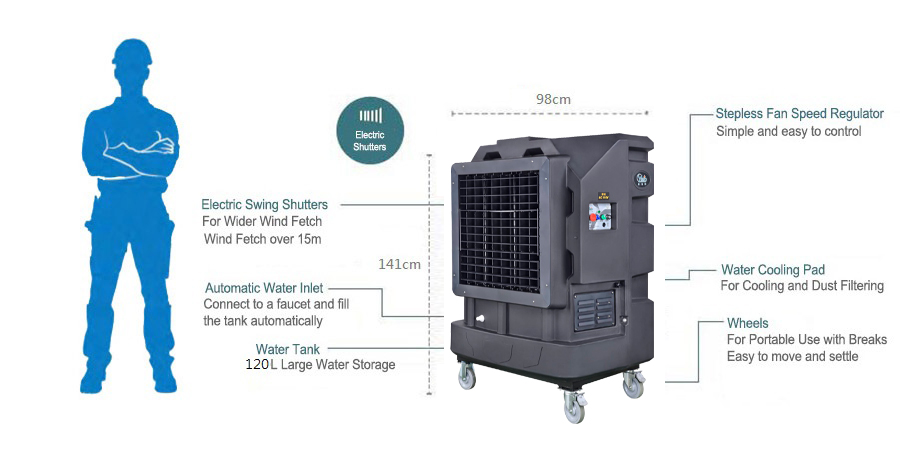 Ya Suh Dar M802-COOL - Refroidisseur adiabatique puissant et écoénergétique Le Ya Suh Dar M802-COOL est un refroidisseur adiabatique mobile et économe en énergie, conçu pour une utilisation professionnelle. Cet appareil Plug & Play assure des températures agréables dans les usines, zones industrielles, halls de production, restaurants ou hôtels. Il est adapté pour des surfaces jusqu’à 160 m² avec un débit d’air de 18 000 m³/heure. Il convient aussi bien au refroidissement des espaces intérieurs qu’extérieurs. Commande simple grâce à l’affichage intuitif : Power : Marche/Arrêt & bouton d’arrêt d’urgence Power of Pump : Activation/désactivation de la pompe Power of Fan : Activation/désactivation du ventilateur, le flux d’air puissant atteint plus de 15 m Fan Speed Regulator : Réglage continu de la vitesse du ventilateur Un refroidisseur adiabatique (refroidisseur par évaporation) rafraîchit l’air ambiant à l’aide d’eau. L’air aspiré traverse un panneau humidifié par l’eau du réservoir, puis est refroidi par évaporation. En plus de rafraîchir l’air, ce type d’appareil filtre efficacement la poussière et les impuretés grâce au cycle d’eau. Ce procédé est économique en énergie et très respectueux de l’environnement. L’appareil peut être raccordé directement à l’alimentation en eau grâce au tuyau fourni, permettant un remplissage automatique du réservoir. Astuce du fabricant : ajouter des glaçons (ou un pad de refroidissement) dans le réservoir permet d’amplifier l’effet de refroidissement. La capacité du réservoir est de 120 litres. Le refroidisseur Ya Suh Dar est conçu pour être facile à nettoyer et à entretenir. Grâce à ses roulettes verrouillables, le refroidisseur adiabatique peut être déplacé et positionné facilement à l’endroit souhaité. Le tuyau d’arrivée d’eau ainsi que le câble d’alimentation peuvent être fixés aux supports latéraux pour un rangement sûr. Caractéristiques Pour des surfaces jusqu’à 160 m² Débit d’air : 18 000 m³/heure Portée du flux d’air : 15 mètres Plug & Play Affichage clair et intuitif Interrupteur Marche/Arrêt de la pompe Interrupteur Marche/Arrêt du ventilateur Vitesse de ventilation réglable Pad de refroidissement par eau Protection contre le fonctionnement à sec Boîtier en polyéthylène robuste et de haute qualité Support pour le tuyau d’arrivée d’eau et le câble d’alimentation Mobile et facile à déplacer grâce aux roulettes avec freins Fabrication taïwanaise, certifié ICO, CE et autres certifications
